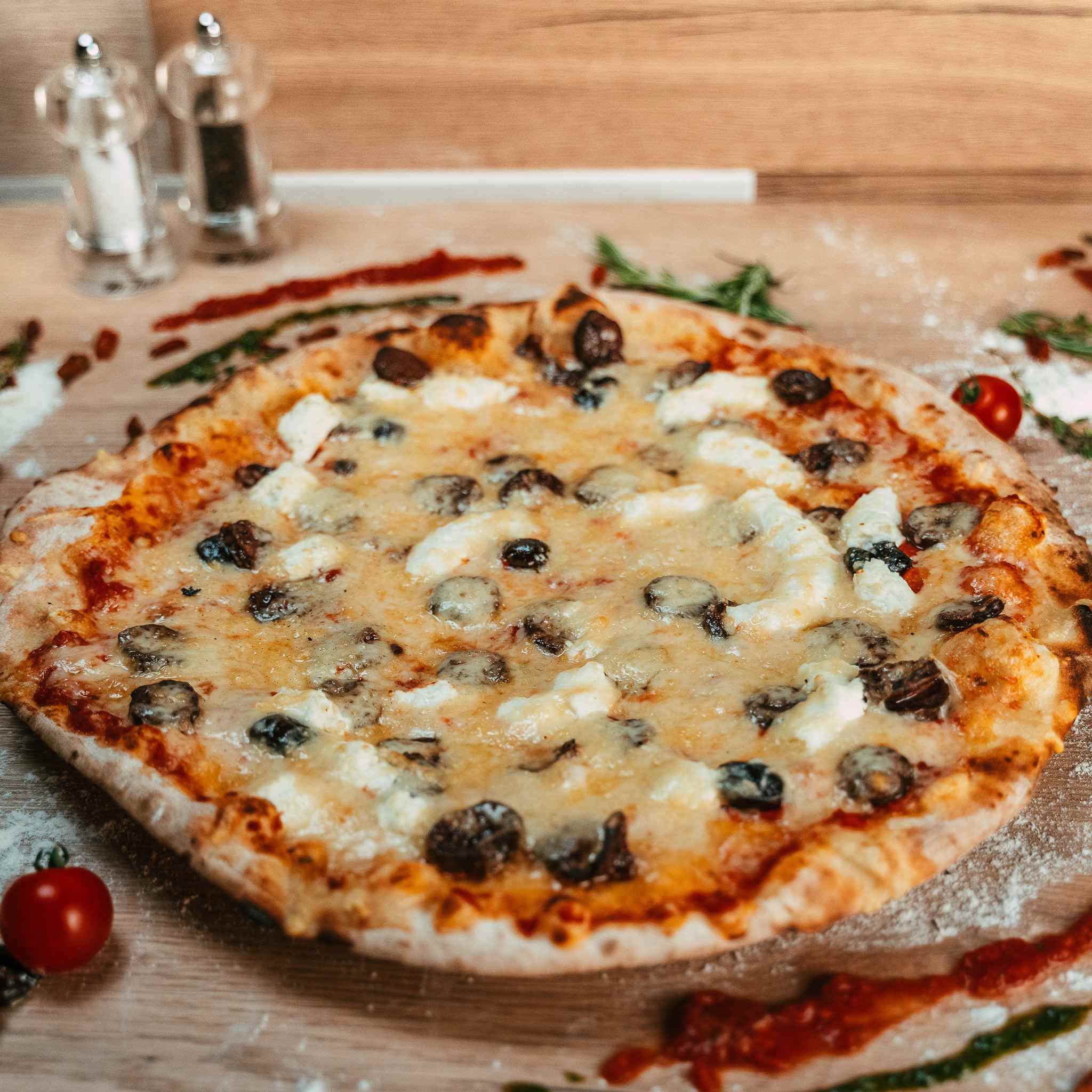 - Sauce tomate - Figatelli - Brousse - Emmental - Olives