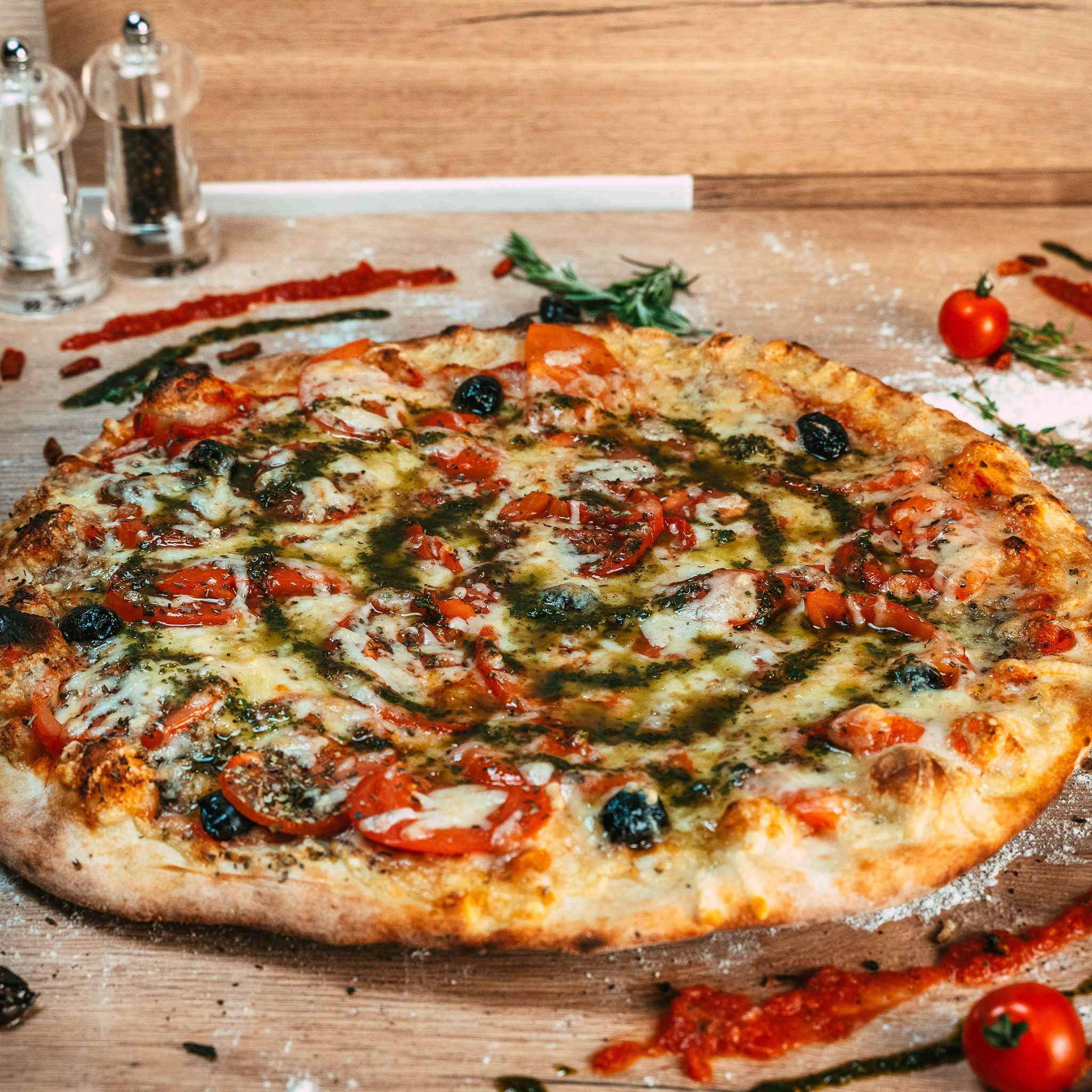 - Sauce tomate - Emmental - Tomate fraîches - Huile d'olive - Pistou - Origan - Olives