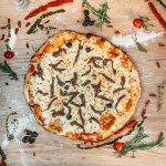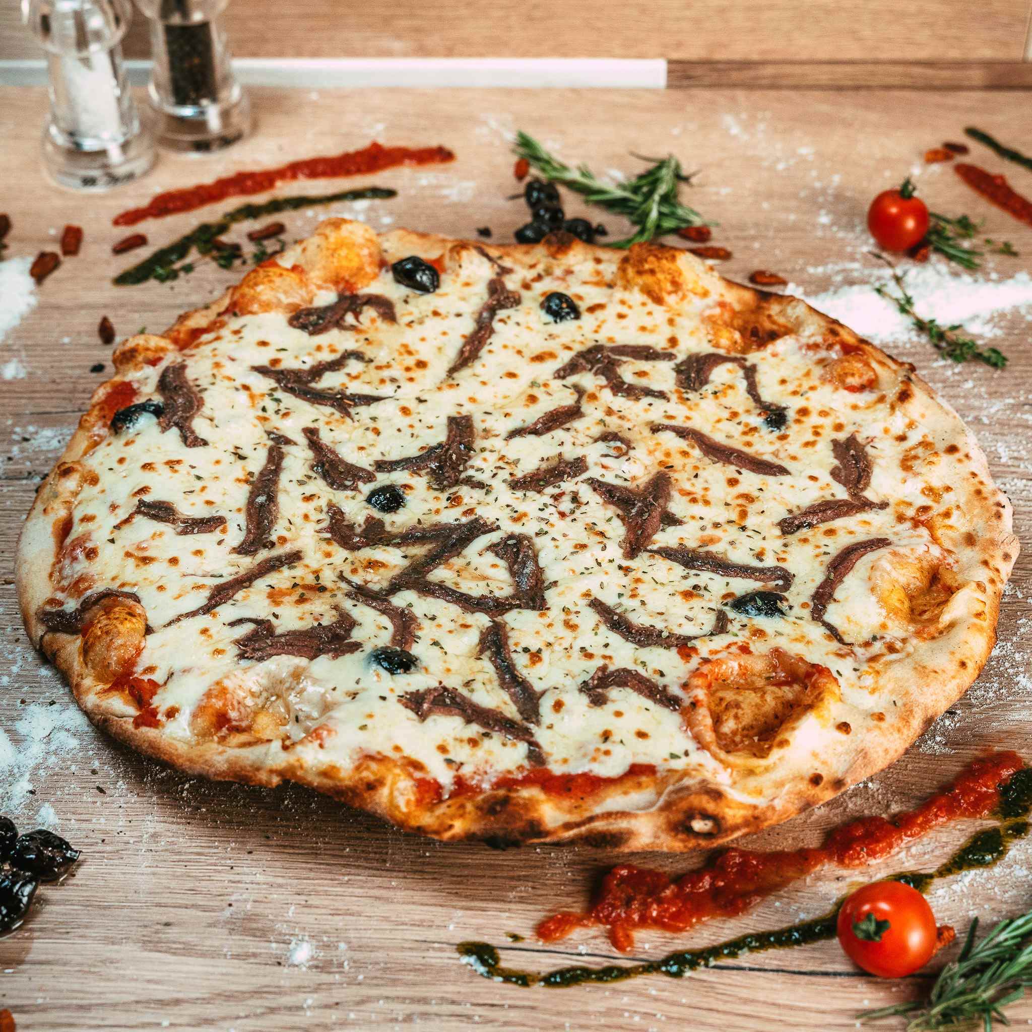 - Sauce tomate - Anchois - Mozzarella - Origan - Olives