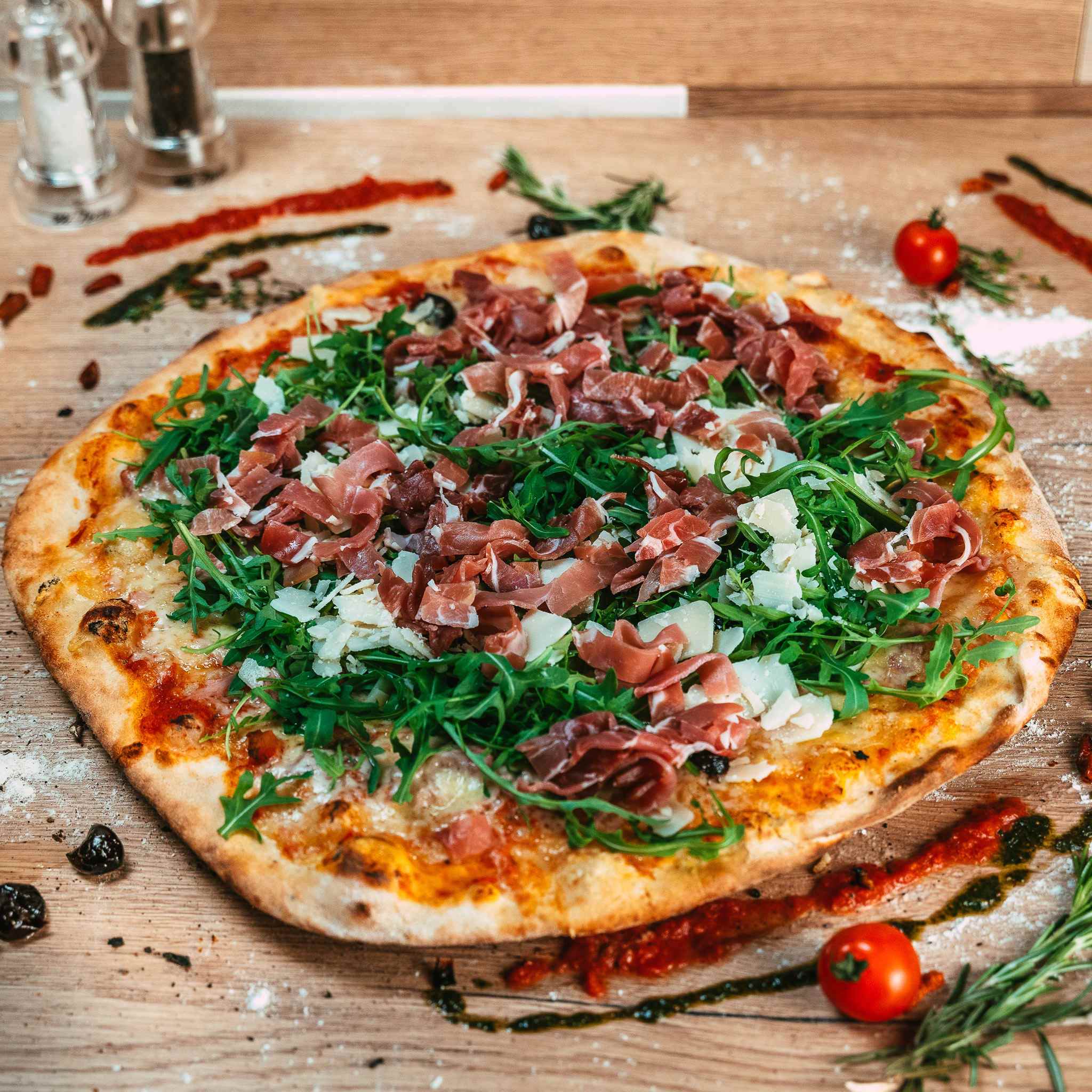 Liste des ingrédients : ✔ Copeaux de jambon cru✘ SANS COPEAUX DE JAMBON CRU✔ Copeaux de parmesan✘ SANS COPEAUX DE PARMESAN✔ Roquette✘ SANS ROQUETTE✔ Mozzarella✘ SANS MOZZARELLA✔ Emmental✘ SANS EMMENTAL✔ Olives✘ SANS OLIVES