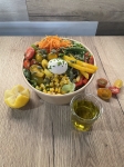Ingrédients : Riz basmati assaisonné, vinaigrette soja sésame, crudités de saison, oeuf poché.
